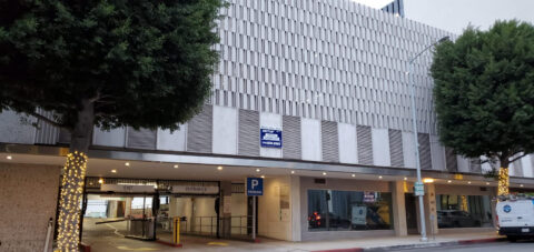 The garage entrance is located on Roxbury Dr between Wilshire and Santa Monica.