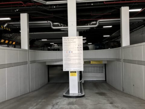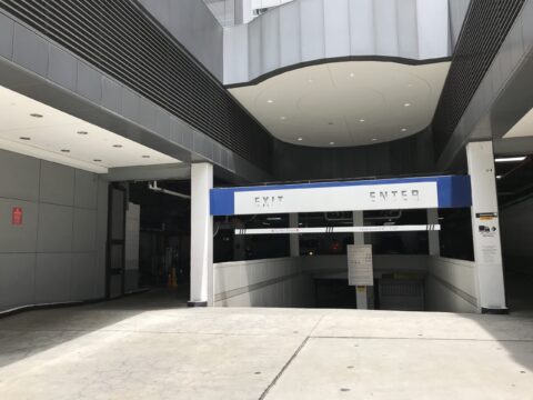 The entrance to the Gas Company Tower parking garage is on Olive Street between 4th Street & 5th Street. Rolling gates are down during after-hours but one may press intercom for access.