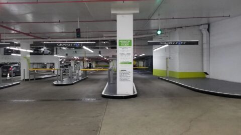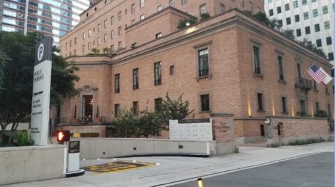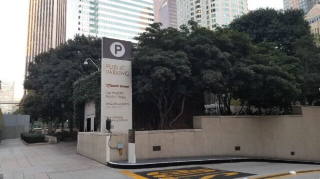 The garage has entrances on Flower Street and located at the between 5th & 6th Street If you are approaching from Flower Street which is a One-way, the garage will be on the left past the Maguire Gardens. Make sure to enter on the left so you do not drive into Flower St & 6th. Look for the Light brown signs.